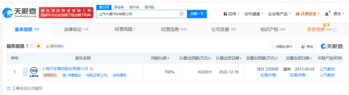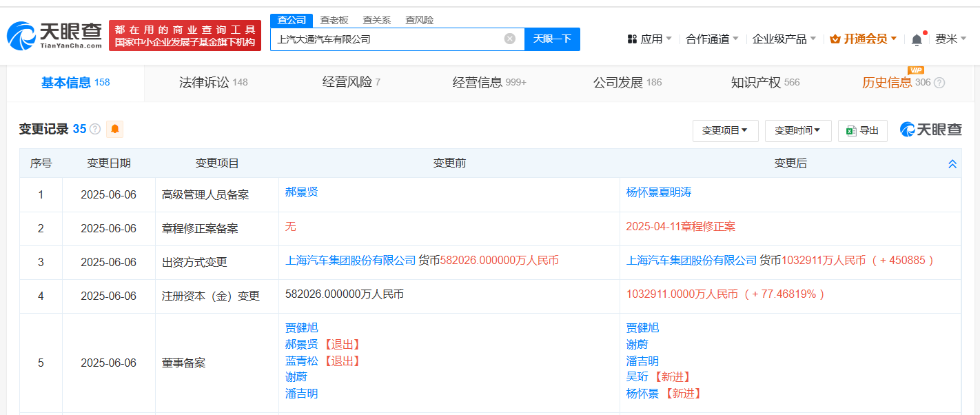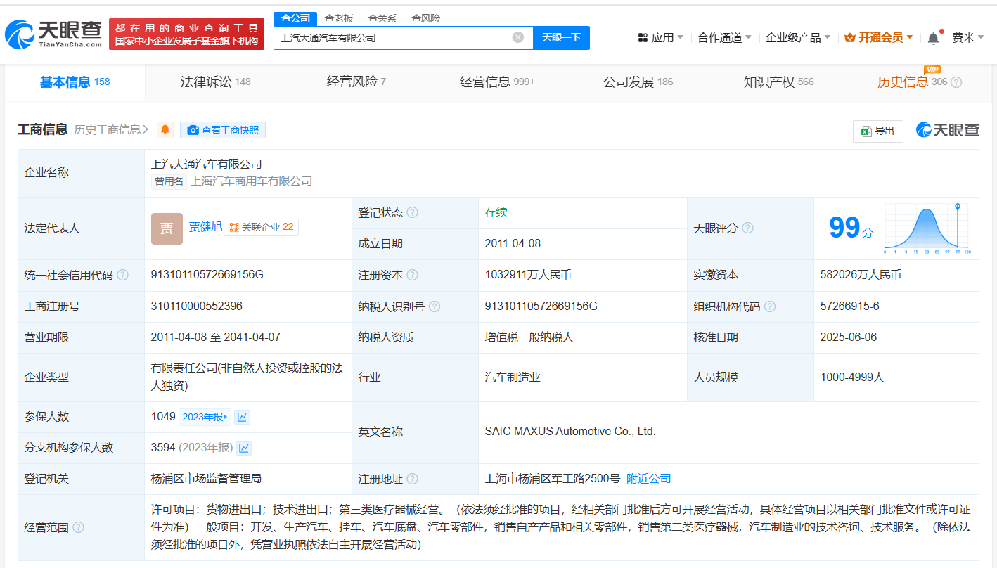 每经AI快讯,天眼查App显示,近日,上汽大通汽车有限公司发生工商变更,注册资本由约58.2亿元人民币增至约103.3亿元人民币,增幅约77%,同时部分高管发生变更。该公司成立于2011年4月,法定代表人为贾健旭,经营范围包括开发、生产汽车、挂车、汽车底盘、汽车零部件,销售自产产品和相关零部件,销售第二类医疗器械等,由上汽集团(600104)全资持股。